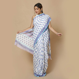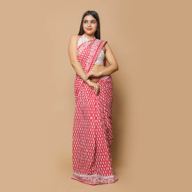 The canvas of this saree tells a story of meticulous craftsmanship, where skilled artisans have brought to life intricate patterns and designs using traditional block printing techniques. The result is a mesmerizing tapestry of artistry, with each block telling a tale of heritage and cultural richness.